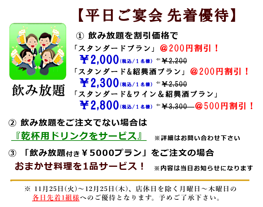 お料理品数、内容はお客様人数・卓数、季節・入荷状況等により変わります。詳しくはお問い合わせください。